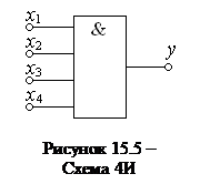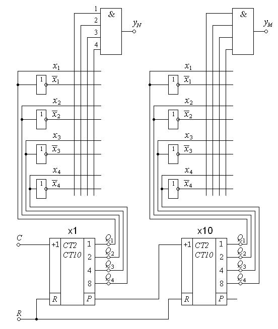 Обобщенная структурная схема рис. 15.6 справедлива для любого варианта задания. Для разработки принципиальной схемы необходимо и достаточно выполнить соединение каждого входа (1; 2; 3; 4) схемы 4И с соответствующим выходом счетчика прямым хі или инверсным