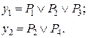 Матрица М2 имеет четыре вертикальные шины P 1 … Р 4 и две горизонтальные у 1 и у 2. Способ включения транзисторов на пересечениях шин позволяет реализовать на любом из её выходов любую дизъюнкцию (функцию ИЛИ) входных переменных. В матрице М2 входными являются вертикальные шины, а выходными – горизонтальные.