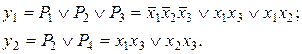 Соответствующим образом любая система булевых функций у 1,..., уN входных переменных х 1,..., хL может быть реализована двухуровневой матричной схемой, на первом уровне которой создаются разные конъюнкции Р 1,..., Р В, а на втором – дизъюнкции у 1,..., уN соответствующих конъюнкций. В результате построение схемы с матричной структурой сводится к определению точек пересечения шин, где должны быть включены диоды или транзисторы.