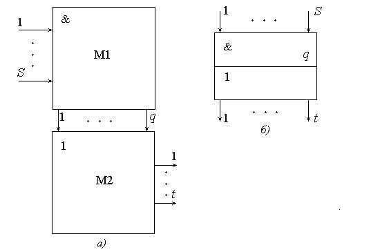 Матрица М1 имеет S входов и q выходов. Она позволяет реализовать q элементарных конъюнкций Р 1,..., Рq переменных х 1,... хS, поступающих на её входы.