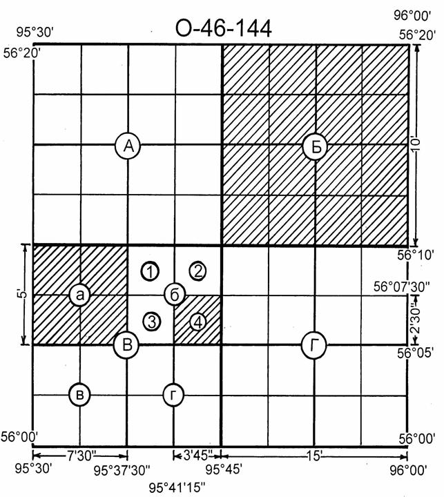 Листы карт масштабов 1: 50 000, 1: 25 000 и 1: 10 000 получают из листа карты масштаба 1: 100 000 последовательным делением листа карты предыдущего более мелкого масштаба на четыре части и обозначают для масштаба 1: 50 000-буквами А, Б, В, Г; для масштаба 1: 25 000 - а, б, в, г и для масштаба 1: 10 000 - цифрами 1, 2, 3, 4.