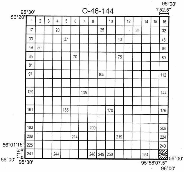 Номенклатура листа масштаба 1: 100 000 в левой верхней части рисунка 8 будет записана О–46–3, то есть к номенклатуре миллионного листа справа приписывается арабскими цифрами обозначение трапеции 3.
