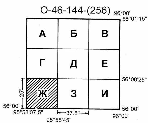 Номенклатура листа масштаба 1: 500 000 в правой нижней части рисунка 8 будет записана О–46–Г, то есть к номенклатуре миллионного листа справа приписывается заглавной буквой русского алфавита обозначение трапеции Г.
