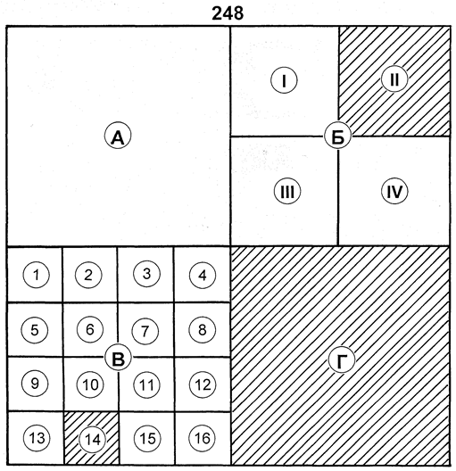 Номенклатура листа масштаба 1: 2 000 в правой нижней части рисунка 12 будет записана 248‑Г, то есть к номенклатуре пятитысячного листа справа приписывается заглавной буквой русского алфавита обозначение листа Г.