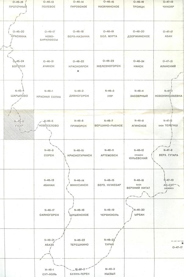 Рисунок 13 – Разграфка и номенклатура трапеций масштаба 1: 200 000. Штриховкой выделен лист N‑45‑8 (Ужур)