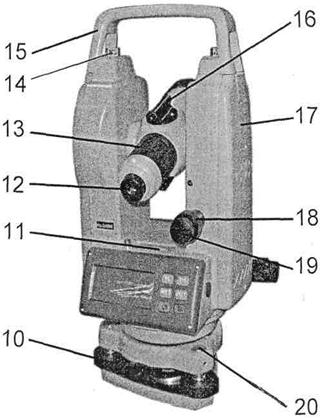 а – вид теодолита со стороны оптического центрира; б – вид теодолита со стороны закрепительного винт трубы и вертикального круга; 1 – подъёмные винты; 2 – функциональные клавиши; 3 – дисплей; 4 – наводящий винт горизонтального круга; 5 – закрепительный винт горизонтального круга; 6 – объектив зрительной трубы; 7 – метка высоты инструмента; 8 – оптический центрир; 9 – основание; 10 – закрепительный винт подставки; 11 – цилиндрический уровень; 12 – кольцо окуляра зрительной трубы диоптрийное; 13 – кремальера (фокусирующее кольцо); 14 – винт ручки теодолита; 15 – ручка теодолита; 16 – коллиматорный визир; 17 – отделение для батарей; 18 – закрепительный винт трубы и вертикального круга; 19 – наводящий винт трубы и вертикального круга; 20 – круглый уровень