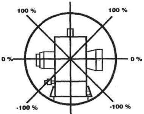 Нажатием клавиши «V%», можно переключить счёт значений вертикальных углов на счёт значений уклонов в диапазоне от 0% до 100%.Режим измерения уклона отмечен на дисплее символом «%». Схема направления счёта величины уклонов представлена на рисунке 19.