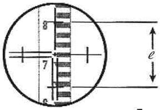 Расстояние можно определить при помощи вертикальной рейки, имеющей сантиметровые деления (приложение Б). Для этого, считывают отсчёты по верхней и нижней дальномерным нитям сетки нитей зрительной трубы, наведённой на рейку (рисунок 20). Коэффициент нитяного дальномера электронного теодолита равен 100, то есть одному сантиметру на рейке между дальномерными нитями соответствует один метр на местности между теодолитом и рейкой. Расстояние от прибора до объекта равно количеству сантиметровых делений, между нитями дальномера выраженному в метрах.