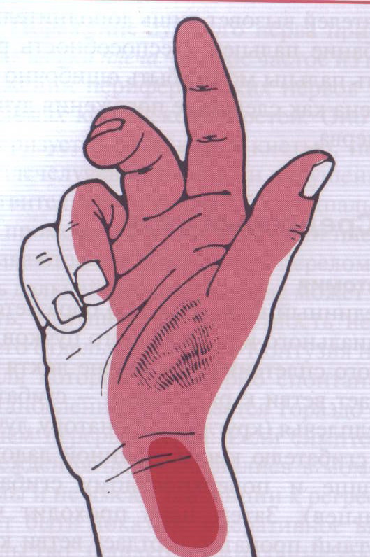 два пальца с локтевого края кисти отведены от остальных. Отведение и приведение пальцев неполное. Из-за слабости мышцы, приводящей большой палец при попытке удержать плоский предмет между большим и указательным пальцами пациент вынужден сильно сгибать большой палец в межфаланговом суставе. (РИС 11.15СТР 732). Граница нарушений чувствительности всегда проходит по середине безымянного пальца и бывает четкой. Мышечная атрофия больше всего выражена в промежутке между большим и указательным пальцами.