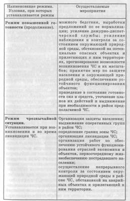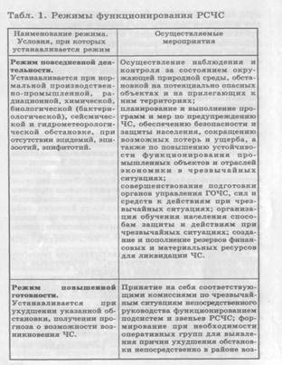 В зависимости от обстановки, масштаба прогнозируемой или возникшей чрезвычайной ситуации решением соответствующих органов исполнительной власти субъектов Российской Федерации и органов местного самоуправления в пределах конкретной территории устанавливаются режимы функционирования РСЧС (таблица 1 на стр. 24-25):