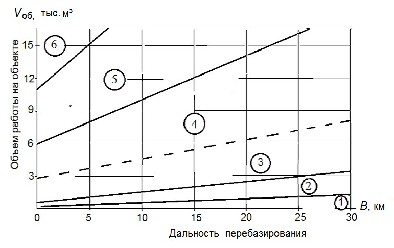 По графикам рисунка для заданных объема работ на объекте V об и дальности перебазирования В выбираются 2 экскаватора рациональных типов и марок. Графики описывают в первом приближении области рационального применения одноковшовых экскаваторов различных типов и облегчает выбор вариантов машин для составления вариантов комплектов.