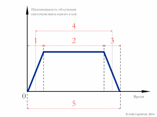 Однако, приведённое определение выдержки подразумевает, что воздействие света начинается и заканчивается мгновенно. В идеальном затворе, к какому бы типу он не относился, выдержка (на англ. shutter speed; дословный перевод – «скорость затвора») и время экспонирования (на англ. exposure time; дословный перевод – «время экспозиции»)1 – временной промежуток, в течение которого вся поверхность или участок светочувствительного материала подвергается максимальному по интенсивности воздействию света, как если бы затвора не было вовсе – понятия тождественные. Реальное положение вещей иное. Время экспонирования короче выдержки. И выдержка определяется как время, пока затвор открыт (на англ. total open time). На рисунке 2 времени экспонирования соответствует отрезок, отмеченный цифрой 2, а выдержке – отрезок, отмеченный цифрой 5.
