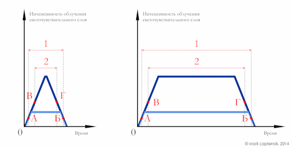Временной промежуток между моментами «А» и «Б» длиннее промежутка между моментами «В» и «Г». Другими словами, эффективное время экспонирования в первом случае превышает эффективное время экспонирования во втором случае.