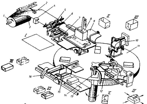 Автомат работает следующим образом (рис. 13). Пергамент смывается с бобины 1 и проходит через отклоняющий ролик 3, к которому прижимается прижимом 2. Датирующее устройство 4 иголками пробивает дату выпуска на краю пергамента. Протягивающими регулируемыми роликами 5 упаковочный материал подается к ножам 6, которые отрезают развертку 1 строго определенной длины. Захватами 7развертка подается на формующую матрицу.9 под пуансон 8, который продавливает ее через матрицу в одно из гнезд. При этом образуется форма коробки II.