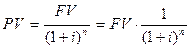 Из формулы (4.2) очевидно, что современные деньги - PV стоят больше, чем деньги, полученные в будущем - FV (через временной интервал, равный n).
