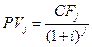Дисконтированная стоимость денежного потока (англ. present value). Расчет дисконтированной стоимости денежного потока основан на концепции дисконтирования и имеет следующий экономический смысл: пусть при заданной ставке дисконтирования i в момент, отстоящий от базового на j, реализуется денежный поток CF. Тогда дисконтированная к базовому моменту величина CF будет равна дисконтированной стоимости денежного потока: