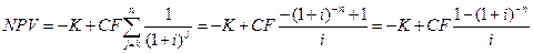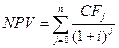 Если денежный поток поступает равными частями в течение рассматриваемого интервала, то он носит название срочного аннуитета. При наличии срочного аннуитета величина CFj как постоянная может быть вынесена за знак суммы и сумма будет представлять сумму убывающей геометрической прогрессии: