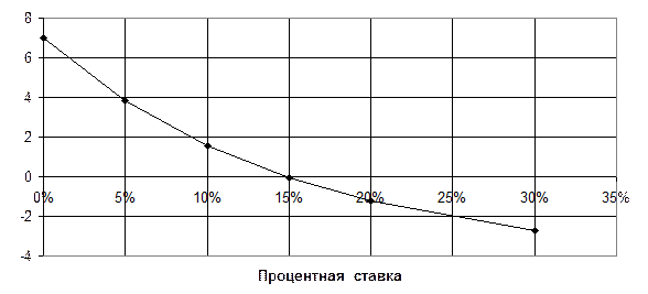 Чистая дисконтированная стоимость существенно зависит от времени и ставки дисконтирования. Это наглядно видно на рис. 4.4, где приведена чистая дисконтированная стоимость на 7-ой год как функция ставки дисконтирования.