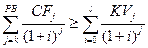 Срок окупаемости инвестиций определяет продолжительность периода, в течение которого чистая дисконтированная стоимость впервые становится равной или большей сумме инвестиций. Для определения срока окупаемости (PB) следует воспользоваться выражением для NPV, положив его равным или большим нуля: