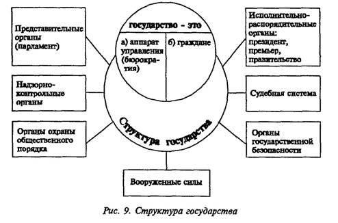 низмом, системой органов и учреждений, которые непосредственно управляют обществом. Механизм государства представлен институтами законодательной, исполнительной и судебной ветвей власти. Для поддержания нормальных условий существования общества государство обладает таким свойством, как принудительность,осуществляемую через органы насилия -армию, службы охраны порядка и безопасности.