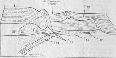 Рисунок. Возможные силы, действующие на литосферные плиты (по С Уеде [293]). FDF – сцепления океанической плиты с астеносферой; FCD – континентального сцепления; FRP – сжатия океанического хребта; F8Р – натяжения субдуцирующей плиты; FSR – противодействующая погружению плиты; FCR – сопротивления столкновения плит; FTF – сопротивления трансформных разломов; FSU – всасывания (Эльзассера).