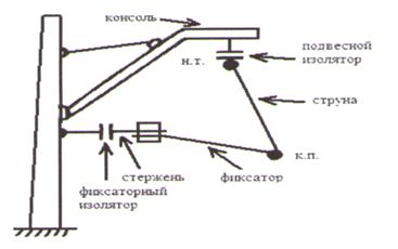 Консоли укреплены в верхней части опор. К ним на изоляторах
