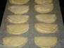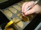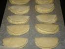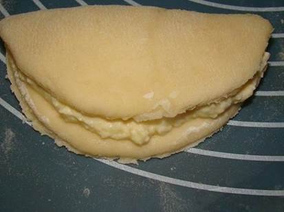 Тесто раскатать,вырезать кружки(внучке это делать понравилось).Положить на одну сторону начинку,другой стороной теста накрыть.