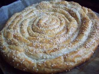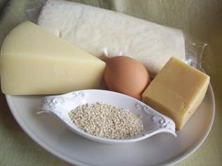 Слоен. тесто - 400 г, сыр твердый - 200 г, сыр мягкий - 100 г, яйцо - 1 шт, кунжут - 1 столовая ложка