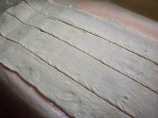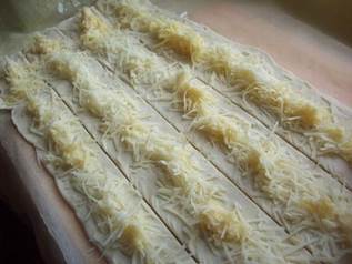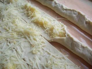 Тесто разворачиваем, слегка раскатываем. Режем на длинные полоски. На каждую накладываем сыр.