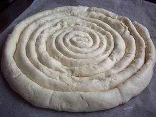 Последовательно выкладываем «колбаски» на противень, накрытый бумагой или смазанный растительным маслом, начиная от центра, скрепляя жгутики между собой. Должна получиться “улитка”.
