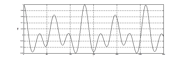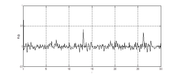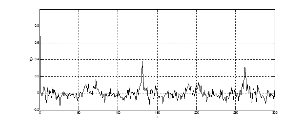 Свойства сигнала наглядно видны по изменению корреляционной функции, представленной на рис. 4.2. Как видно из графика период основного тона составляет 130 отсчетов. В корреляционной функции также присутствуют колебания с различной частотой. Это приводит к росту порядка модели АР и многомодовости параметрической СПМ. Большой интервал затухания корреляционной функции свидетельствует об узкополосности сигнала фонемы «У». Квазипериодичность корреляционной функции свидетельствует о квазидетерминированности гласных фонем.