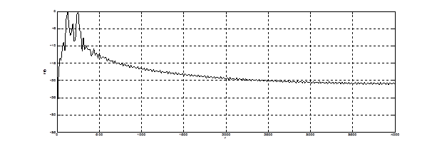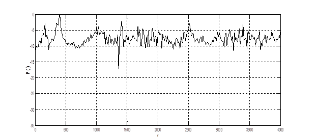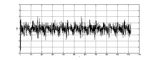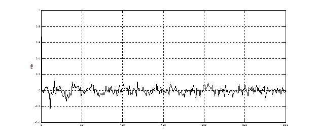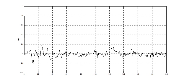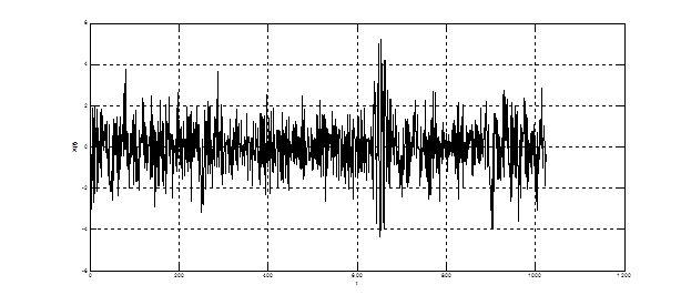 Восьмизвенный решетчатый фильтр краткосрочного предсказания преобразовывает входной коррелированный процесс в квазишумовой сигнал. Т.к в кодере речи стандарта GSM порядок фильтра не адаптируется к кодируемому процессу, то на выходе LPC сигнал не является истинным белым шумом. Таким образом, на выходе фильтра получается не ошибка предсказания, а частично коррелированный остаток предсказания. Мгновенные значения остатка предсказания на выходе блока LPC представлены на рис. 4.27. Как видно из графика, процесс является существенно обеленным.