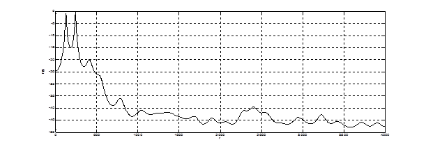 На рис. 4.14 представлена СПМ, полученная преобразованием Фурье от корреляционной функции фонемы (рис. 4.13). Из графика видно наличие нескольких низкочастотных мод (150 – 250 Гц). Дисперсия оценки значительна, т.к. не использовалось сглаживающее окно.