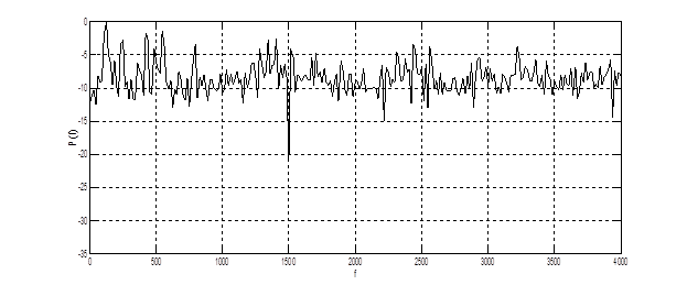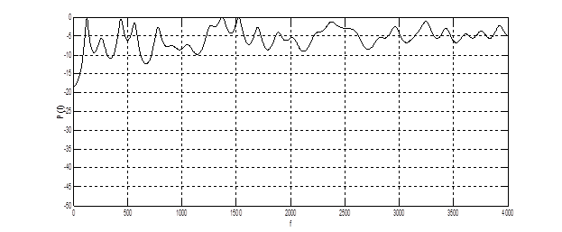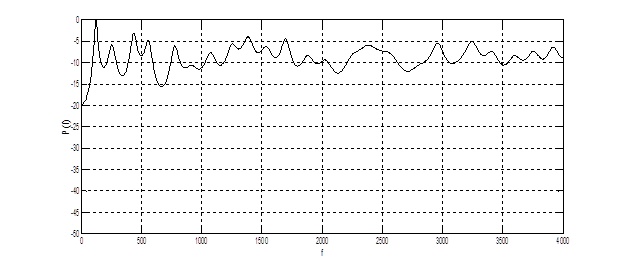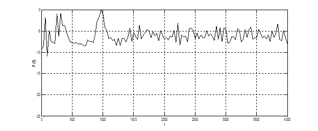 На рис. 4.3 представлена СПМ, полученная преобразованием Фурье от корреляционной функции фонемы (рис. 4.2). Из графика видно наличие нескольких низкочастотных мод (150 – 400 Гц). Дисперсия оценки значительна, т.к. не использовалось сглаживающее окно.