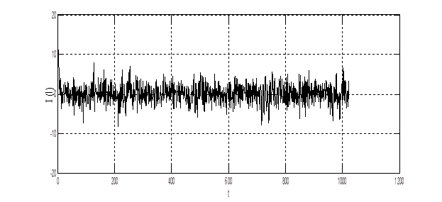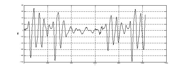 В процессе кодирования фонемы сигнал подвергается обелению. Восьмизвенный решетчатый фильтр краткосрочного предсказания существенно преобразовывает входной коррелированный процесс в квазишумовой сигнал. Т.к. в кодере речи стандарта GSM порядок фильтра не адаптируется к кодируемому процессу, то на выходе LPC сигнал не является истинным белым шумом. Таким образом, на выходе фильтра получается не ошибка предсказания, а частично коррелированный остаток предсказания. Мгновенные значения остатка предсказания на выходе блока LPC представлены на рис. 4.6. Как видно из графика, процесс является существенно обеленным.