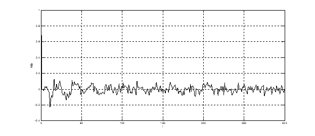 Восьмизвенный решетчатый фильтр краткосрочного предсказания преобразовывает входной коррелированный процесс в квазишумовой сигнал. Т.к. в кодере речи стандарта GSM порядок фильтра не адаптируется к кодируемому процессу, то на выходе LPC сигнал не является истинным белым шумом. Таким образом, на выходе фильтра получается не ошибка предсказания, а частично коррелированный остаток предсказания. Мгновенные значения остатка предсказания на выходе блока LPC представлены на рис. 4.17. Как видно из графика, процесс является существенно обеленным.