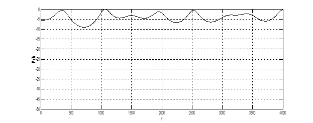 Параметрическая оценка спектра остатка предсказания на выходе блока LTP показана на рис. 4.11. Из графика видно наличие слабых пиков, особенно на низких частотах. Отличие остатка предсказания от белого шума требует его передачи после прореживания на приемник мобильной станции абонента.