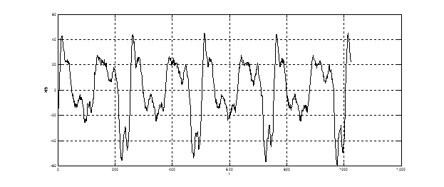 На рис. 4.23 представлен сигнал фонемы «М» на входе блока LPC. Как видно из графика, сигнал согласной носовой является стационарным процессом. В нем присутствует колебания с несколькими различными частотами, что проявится в форме корреляционной функции и СПМ.