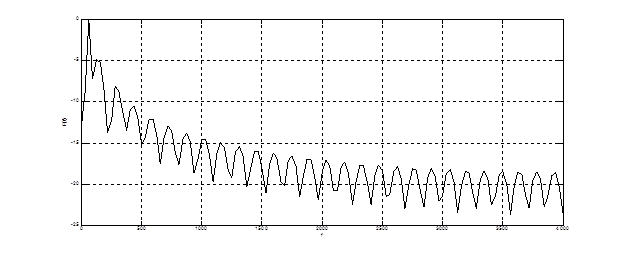 При прохождении остатка предсказания фонемы «М» через трехзвенный решетчатый фильтр долговременного предсказания происходит его дальнейшее обеление. Это наглядно видно из графика корреляционной функции остатка предсказания на выходе блока LTP, показанного на рис. 4.31. Анализ графика показывает уменьшение дисперсии корреляционной функции.
