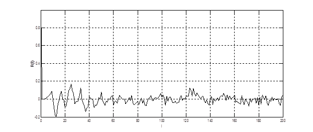 Частичная коррелированность остатка предсказания фонемы «Р» видна на графике корреляционной функции, представленной на рис. 4.18. На близость анализируемого процесса к белому шуму указывает быстрое спадание к нулю корреляционной функции при малых сдвигах. В то же время наличие значительных колебаний корреляционной функции вокруг нулевой линии свидетельствует о наличии слабой корреляции.