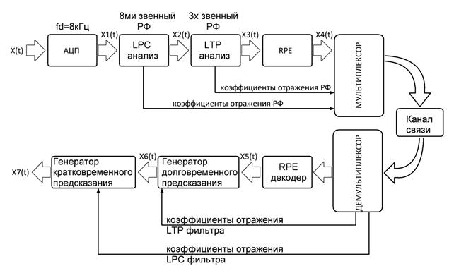 X(t) - аналоговый сигнал; fd – частота дискретизации; АЦП - аналого-цифровой преобразователь; LPC - (eng. Linear Predictive Coding) фільтр кратко временного предсказания; LTP - (eng. Long Term Prediction) фільтр долговременного предсказания; RPE - (eng. Regular Pulse Excition) регулярное импульсное возбуждение; РФ – решетчатый фильтр; X1(t) - оцифрованный сигнал; X2(t), X3(t) - остатки предсказания РФ кратковременного и долговременного анализа; X5(t), X6(t) - восстановленные остатки предсказания фильтров LPC и LTP соответственно; X7(t) - Восстановленная речь в цифровом виде.