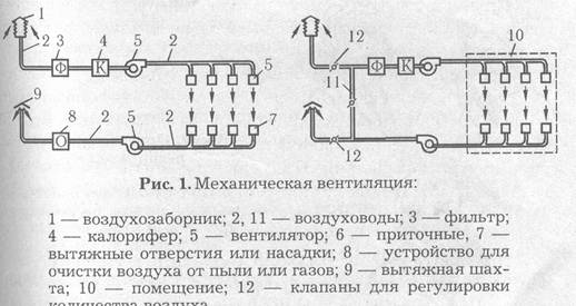 На предприятиях используют различные системы вентиляции (рис. 1 — 4), но преимущественно приточно-вытяжную с механическим побуждением.