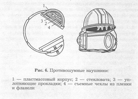 На особо шумных производственных предприятиях — используют индивидуальные шумозащитные приспособления: антифоны, противошумные наушники (рис. 6) и ушные вкладыши типа "беруши". Эти средства должны быть гигиеничными и удобными в эксплуатации. В России разработана система оздоровительно-профилактических мероприятий по борьбе с шумом на производствах, среди которых важное место занимают санитарные