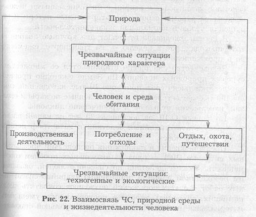 Тысячелетняя практика жизнедеятельности человека свидетельствует о том, что ни в одном виде деятельности невозможно достичь абсолютной безопасности. Следовательно, любая деятельность потенциально опасна. На рис. 22.представлена взаимосвязь человека, его жизнедеятельности и чрезвычайных ситуаций природного и техногенного характера.