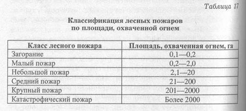 По площади, охваченной огнем, лесные пожары под разделяются на шесть классов (табл. 17).