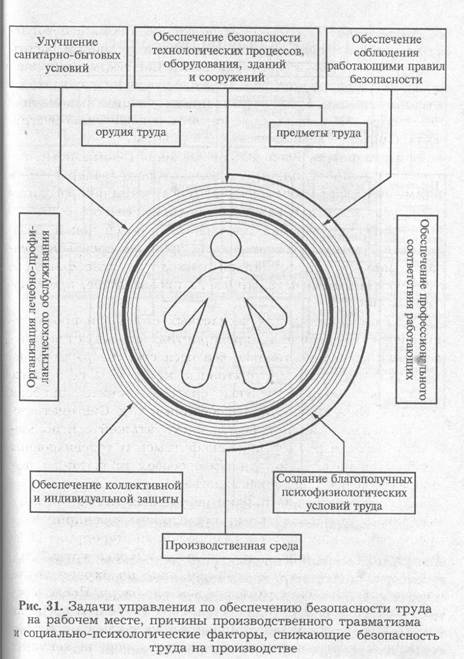 Схематично задачи управления по обеспечению безопасности труда на рабочем месте, причины производствен- ного травматизма, социально-психологические факторы, снижающие безопасность труда на производстве, представлены на рис. 31 — 32.