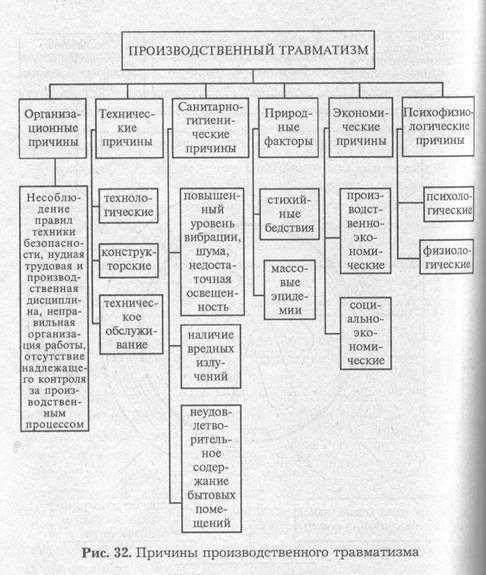 Технические причины в большинстве случаев проявляются как результат конструктивных недостатков оборудования, недостаточности освещения, неисправности защитных средств, оградительных устройств и т. п. К организационным причинам относятся несоблюдение правил техники безопасности из-за неподготовленности работников, низкая трудовая и производственная дисциплина, неправильная организация работы, отсутствие надлежащего контроля за производственным процессом и др.