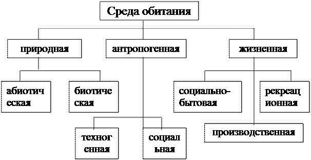 Комплекс предметов и явлений окружающей природной и социальной действительности, с которыми человек взаимодействует на протяжении жизни, принято называть жизненной средой человека. В нее входят социально-бытовая (городская и жилищная), производственная (трудовая) и рекреационная среды. В процессе жизнедеятельности человек непрерывно взаимодействует не только с естественной средой и техносферой, но и с людьми, образующими социальную среду, которая по словам Н.Ф. Реймерса представляет, прежде всего, культурно-психологический климат, намеренно или непреднамеренно создаваемый самими людьми и слагающийся из влияния людей друг на друга, осуществляемого непосредственно, а также с помощью средств материального, энергетического и информационного воздействия.
