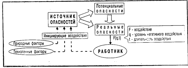 В производственной среде, являющейся частью техносферы, имеются источники опасностей для жизни и здоровья работающих. К ним относятся здания и сооружения; технологическое, энергетическое, подъемно-транспортное и иное оборудование; транспорт; инструмент и другие материальные объекты. Один и тот же элемент производственной среды может быть источником опасностей нескольких видов, например, шума, вибрации, загрязнения воздушной среды и др. Опасности, генерируемые этими источниками, носят название техногенных и могут быть разделены на опасности потенциальные и реальные. Первая группа опасностей включает факторы, несущие скрытую (потенциальную) угрозу здоровью работников. Вторая группа состоит из опасностей, которые реально, в данный момент или на протяжении какого-либо периода времени, негативно воздействуют на человека. При определенных условиях, когда на источник опасностей воздействует инициатор опасностей, потенциальные опасности превращаются в реальные. Схема воздействия опасностей на человека в системе «человек – производственная среда» показана на рис. 3. Одна из особенностей этой системы – то, что работник выступает в этой среде одновременно как объект негативного воздействия и как инициатор образования реальных опасностей или преобразования потенциальных опасностей в реальные. Его инициирующие воздействия на источник опасностей –результат усталости, невнимательности, непрофессионализма, умышленного или случайного нарушения правил охраны труда и т.п. Другими инициаторами опасности являются объективные факторы природного (ветер, гроза, атмосферная влага и др.) и техногенного (выход из строя оборудования, пробой изоляции в электрических цепях, разгерметизация емкостей и др.) характера. Потенциальные и реальные опасности в производственной среде проявляются в виде вредных и опасных производственных факторов.