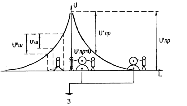 Наибольший потенциал, равный потенциалу заземлителя IЗ, имеет точка земли, расположенная точно над заземлителем. При удалении от заземлителя в любую сторону потенциалы точек земли снижаются по гиперболическому закону. При этом падение напряжения на расстоянии 1 м от заземлителя составляет 68 %, 10 м – 92 %, а на расстоянии 20 м от заземлителя потенциалы точек земли имеют нулевое значение. Человек, находящийся в зоне растекания, может попасть под шаговое напряжение. Напряжение шага (UШ) – напряжение между двумя точками на поверхности земли, на расстоянии 1 м одна от другой, которое принимается равным длине шага человека. Величина UШ зависит от: